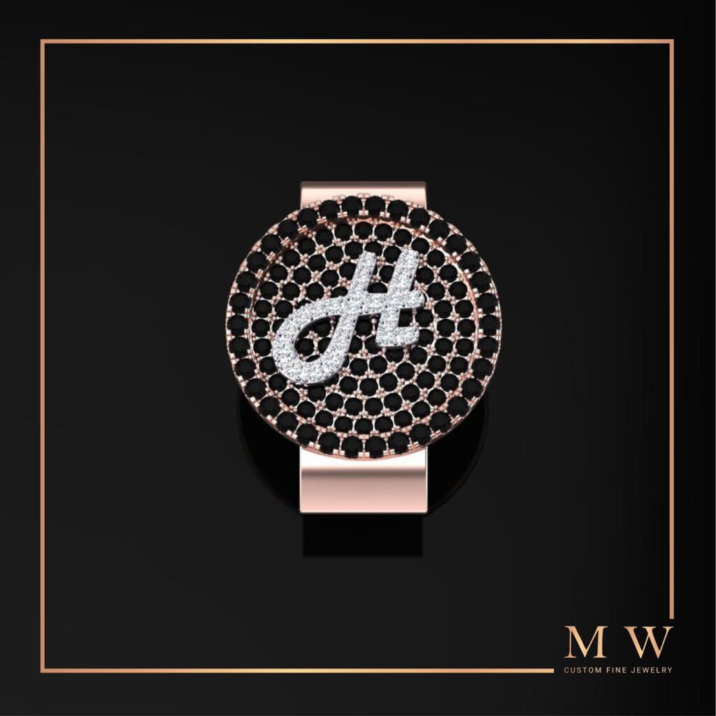 (Kẹp áo/kẹp tiền đính kim cương thiên nhiên trắng trên chữ H trong tên Henry, sản phẩm làm từ vàng hồng 14k, trị giá 30 triệu)